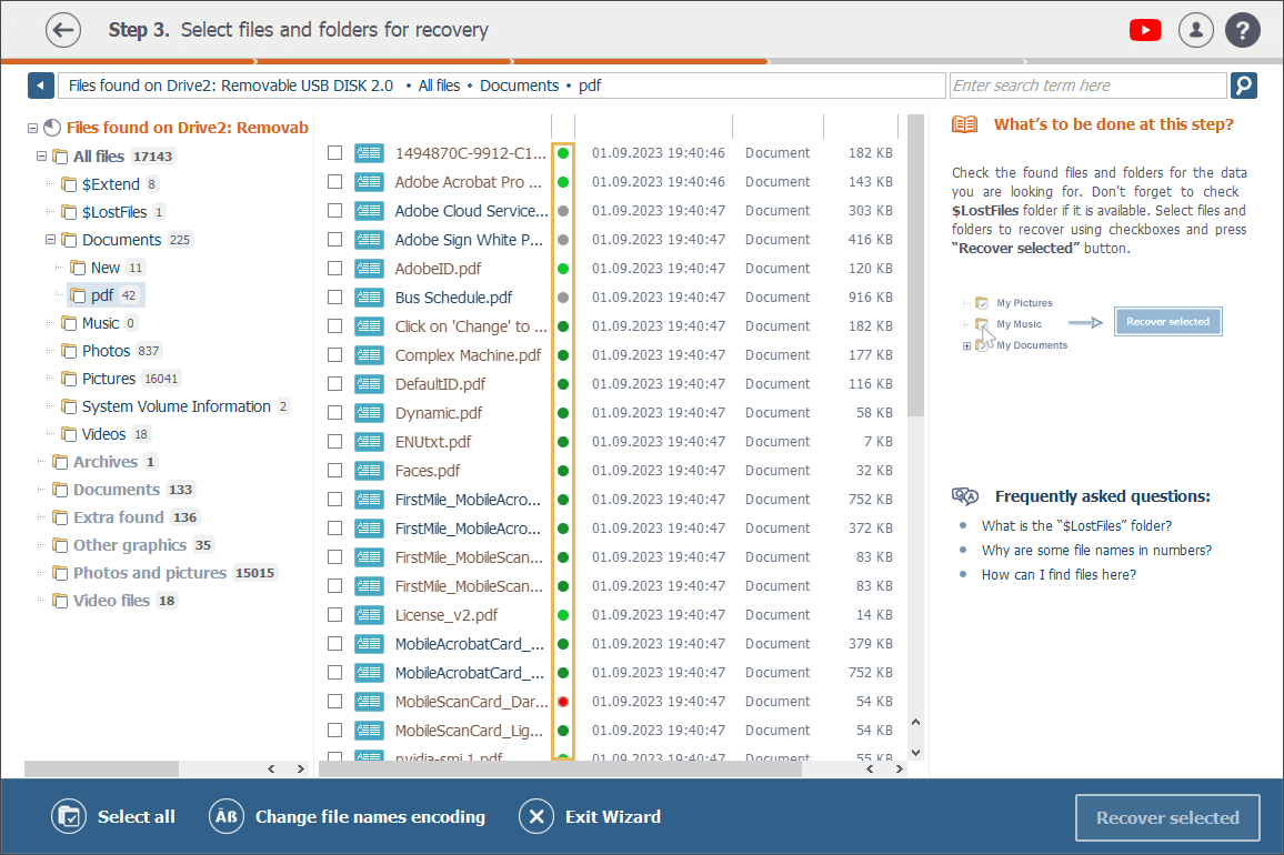 Para su comodidad, la mayoría de los tipos de archivos están marcados con iconos especiales para que puedan distinguirse fácilmente del resto. Los nombres de los archivos que el software ha recuperado están marcados en marrón, lo que ayuda a diferenciarlos de los actuales.